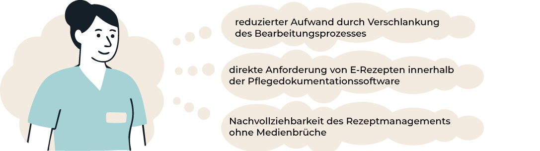 Eine Pflegefachperson bemerkt am Morgen, dass ein Bewohner ein Folgerezept für seine Dauermedikation benötigt. Statt die Arztpraxis telefonisch zu kontaktieren, wird das Medikament digital via KIM angefordert und das E-Rezept direkt von der Arztpraxis an die Pflegeeinrichtung übermittelt. Die Pflegefachperson leitet es via KIM an die Apotheke weiter, die Lieferung erfolgt noch am selben Tag – ohne Medienbrüche, ohne Zeitverlust.